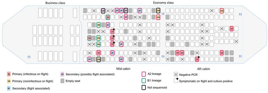 Los pasajeros que ya estaban infectados estaban divididos casi equitativamente entre la parte delantera y trasera. Pero los 11 nuevos contagiados se hallaron en el medio del avión, en clase económica. De ellos, siete estaban en los asientos del lado de las ventanillas, un hallazgo que contradice las afirmaciones realizadas previamente sobre un mayor riesgo en el pasillo por una presunta mayor exposición a los patógenos.