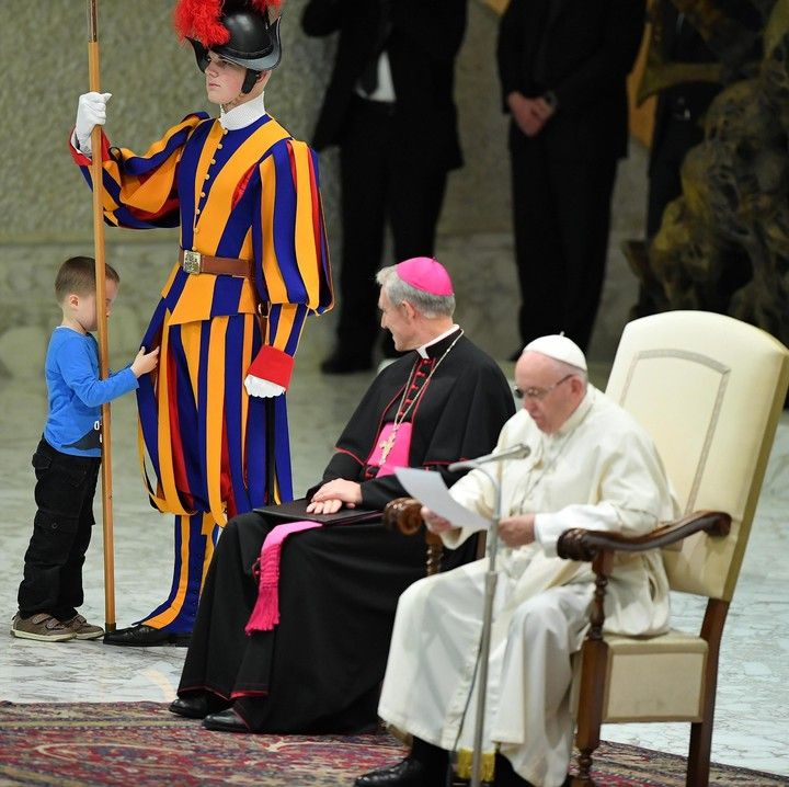 Wenzel Eluney estaba sentado en las primeras filas de la sala, donde se sitúan los enfermos, y en un momento determinado escapó de su madre y subió a la zona donde estaba sentado el pontífice celebrando la audiencia y se puso a jugar alrededor de uno de los guardias suizos y a correr por ese espacio.