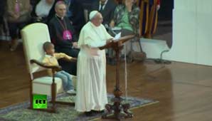 El pequeño incluso saludó a la audiencia y tomó asiento en la silla del Papa, para la diversión de los espectadores.