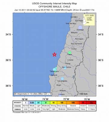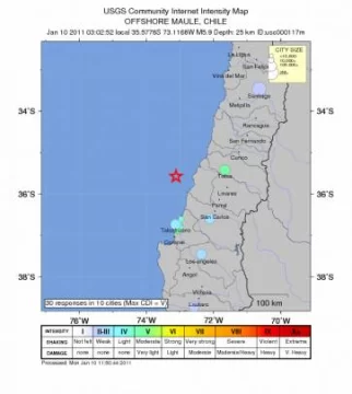 Chile, 10 de enero.- Un sismo de magnitud 5,9 se registró esta madrugada frente a la costa central de Chile, informó el instituto geológico de los Estados Unidos.