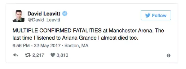 David Leavitt, escritor freelance de CBS, Massachusetts, causó indignación por bromear sobre los fallecidos, cuando twitteó: "Múltiples muertos confirmados en el Manchester Arena. La última vez que escuché a Ariana Grande, yo casi muero también". Otros usuarios de las redes respondieron rápidamente al indignante tuit, llamando al señor Leavitt "una vergüenza".