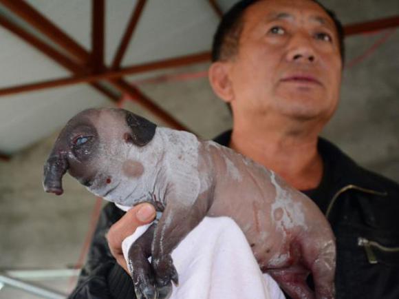 China, 27 de octubre.- En lo que parece ser resultado de un experimento científico para cruzar un elefante y un chancho, un animal con lo que parece ser una trompa y sin boca nació en el noreste de China.