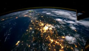 También se percibe la ionósfera de la Tierra (una fina línea amarilla) y las estrellas de nuestra galaxia.
