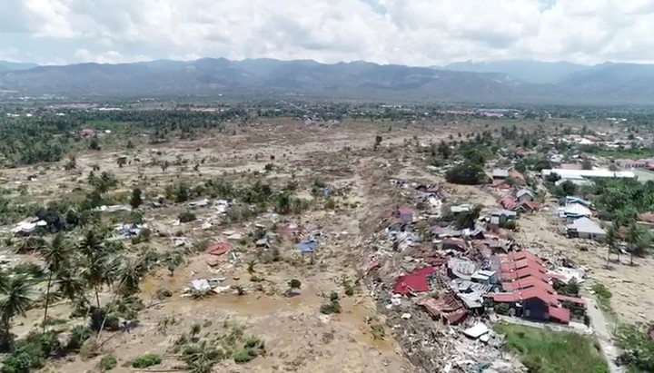 La cámara de un dron ha captado desde el aire imágenes que reflejan el devastado estado en el que ha quedado la isla indonesia de Célebes, afectada este 28 de septiembre por un violento terremoto de magnitud 7,5 y un posterior tsunami.