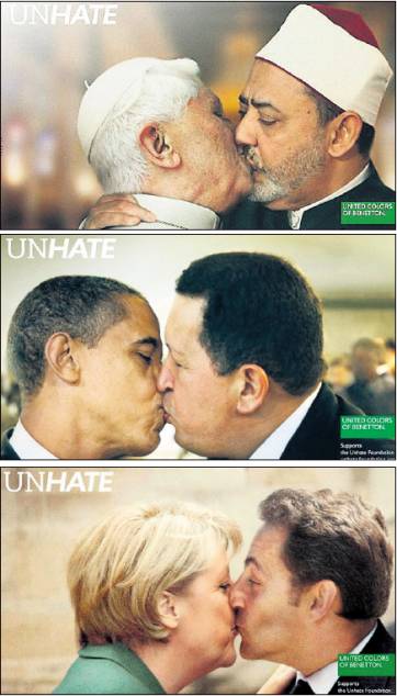 En la nueva campaña de Benetton aparecen distintos líderes mundiales dándose besos en la boca: en una de ellas están el presidente venezolano, Hugo Chávez, y su homólogo estadounidense, Barack Obama; en otra Obama también se besa con su par chino, Hu Jintao. Otra fotografía muestra cómo el presidente francés, Nicolas Sarkozy, y la canciller alemana, Angela Merkel, se dan un tórrido beso en la boca con los ojos cerrados.