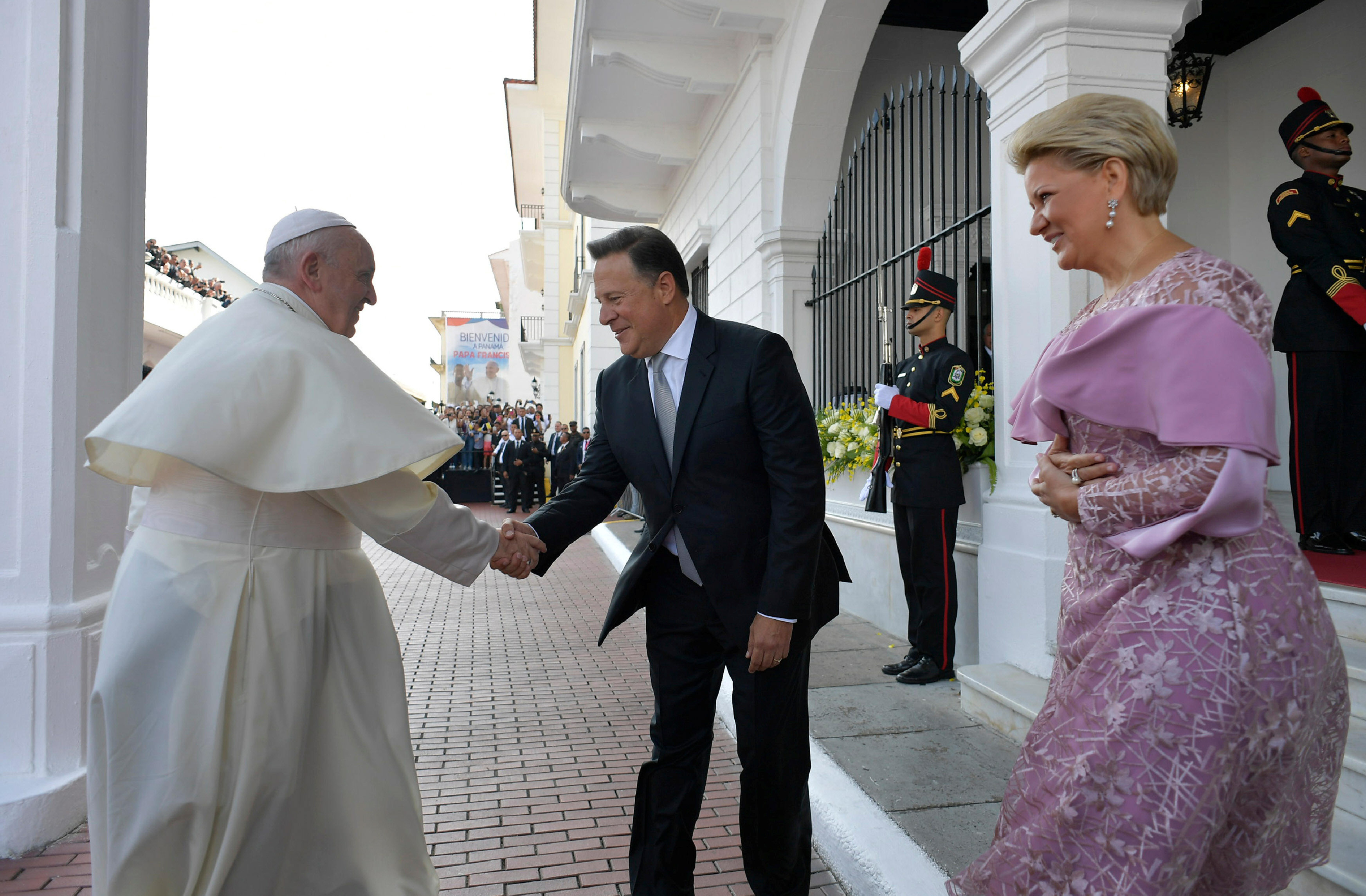 A primera hora. Francisco fue recibido en el Palacio de Gobierno por el presidente Juan Carlos Varela y su esposa. Conversaron en privado.