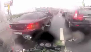 Cuando un auto intentó pasar del carril izquierdo al derecho, la moto impactó de lleno contra el vehículo y el motociclista devenido en camarógrafo terminó en el suelo.