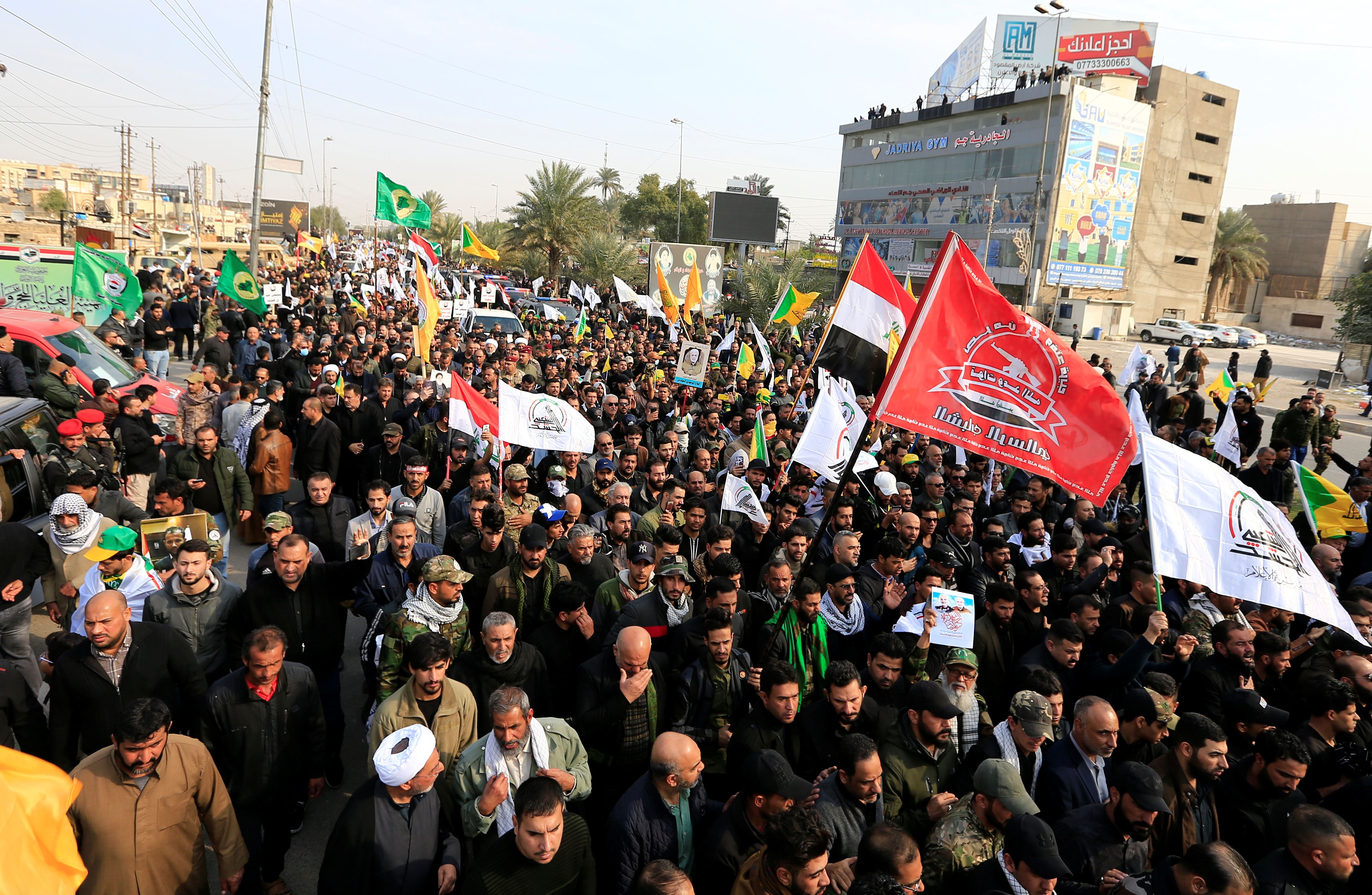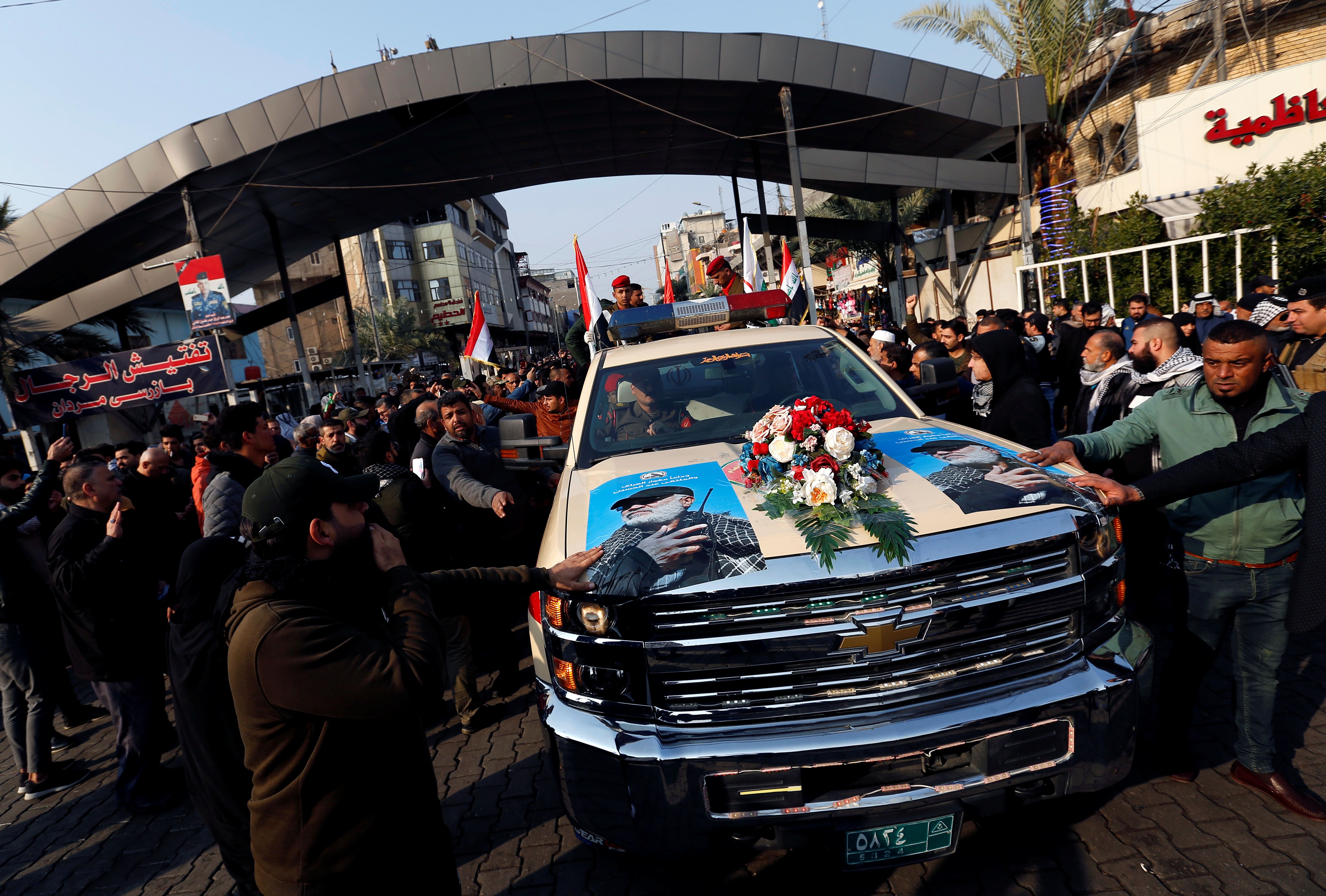 Miles de personas gritaban "¡Muerte a Estados Unidos!" en el barrio chiita de Kazimiya, en Bagdad, cuando acompañaban los féretros del general.