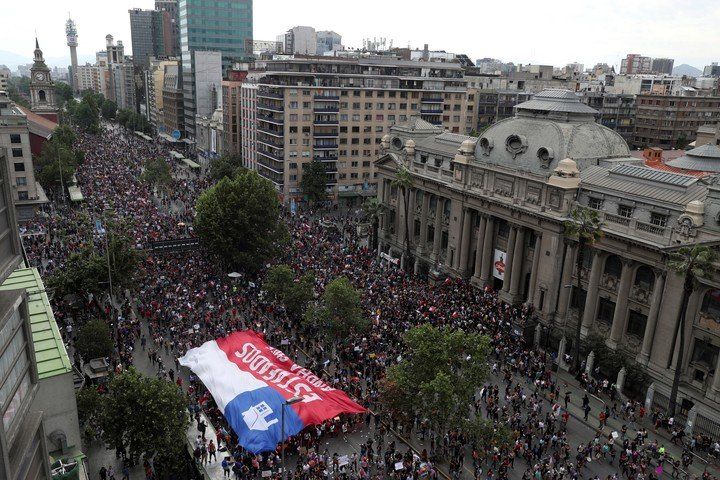 Entonando canciones populares durante la dictadura de Augusto Pinochet (1973-90), saltando y con banderas chilenas y mapuches, los manifestantes se congregaban en anchas avenidas de la capital para atender el llamado de la “Marcha más grande de Chile”, una semana después de que uno de los países más estables de América Latina quedara sumido en su peor crisis social.