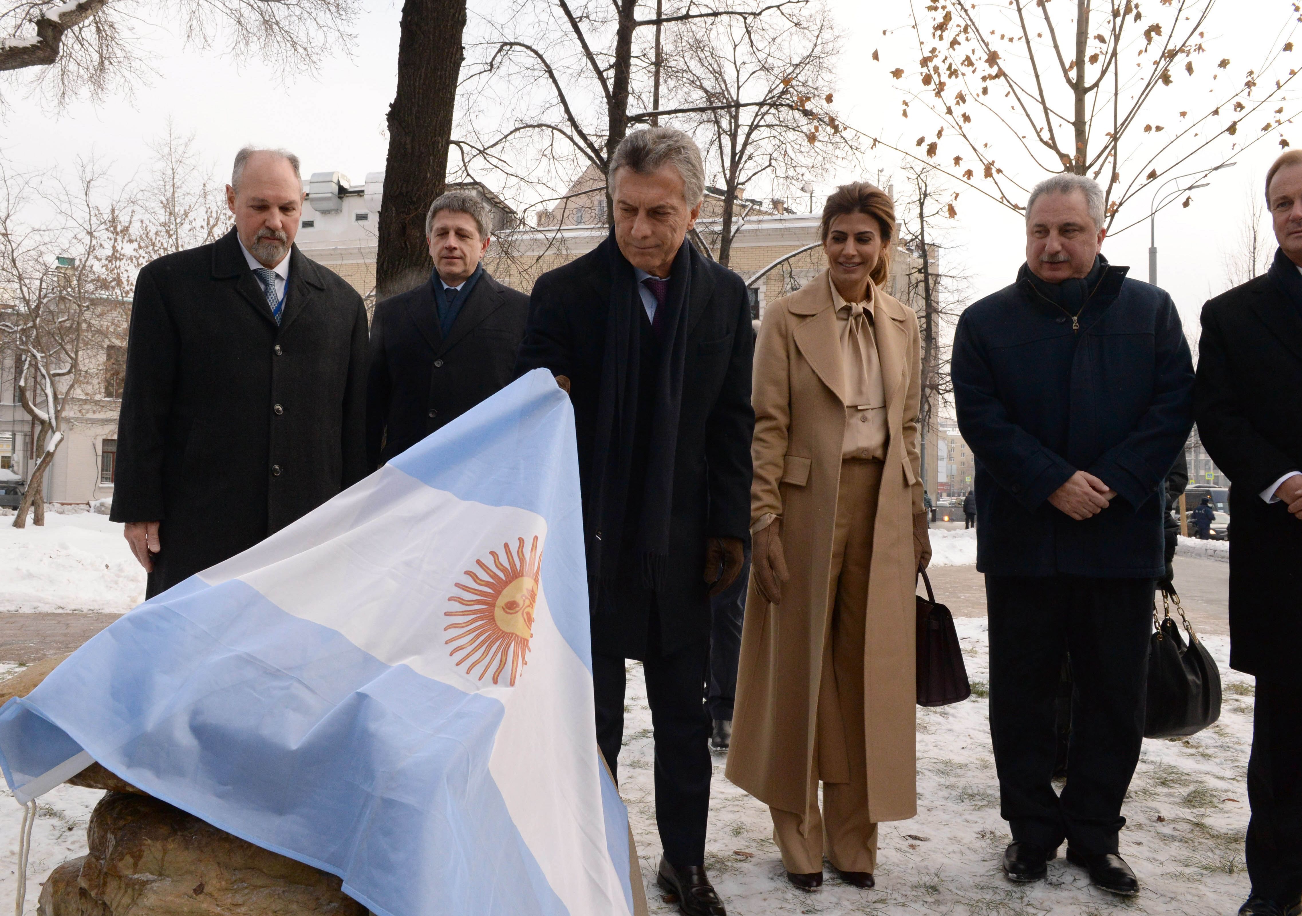 Mauricio Macri encabezó ayer la inauguración de la Plaza República Argentina en Moscú y depositó una ofrenda floral en la tumba del Soldado Desconocido, tras reunirse con empresarios locales en su visita a Rusia. La plazoleta está ubicada en el centro de Moscú, cerca de la embajada argentina, en la calle Zhitnaya, en el distrito de Yakimanka. Con una temperatura de 9 grados bajo cero que se reflejaba en la nieve que cubría casi todo, el Presidente encabezó el acto acompañado de la primera dama Juliana Awada; los gobernadores de Entre Ríos, Gustavo Bordet, y de Misiones, Hugo Passalacqua; entre muchos otros.
