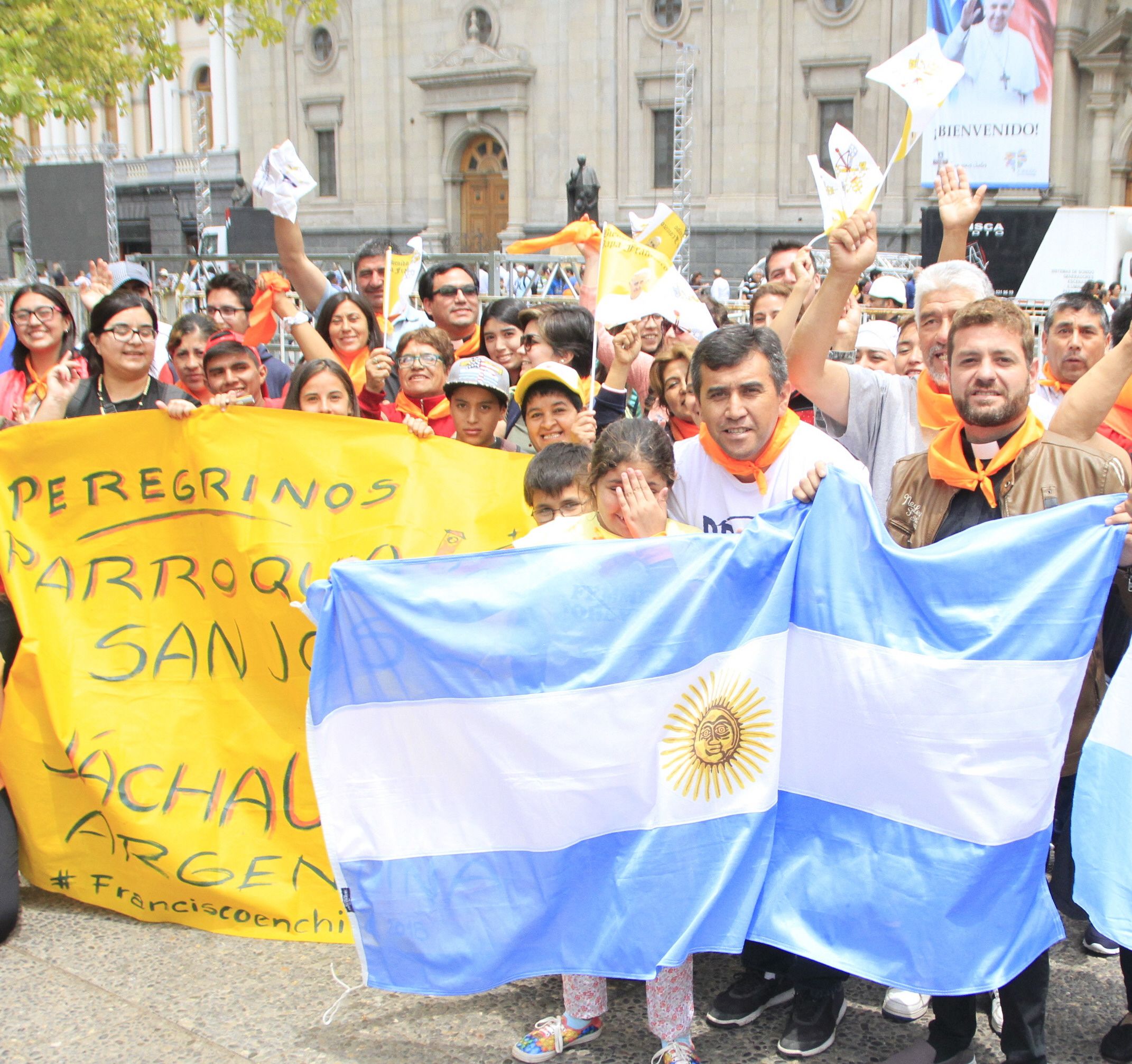 La Plaza de Armas, frente a la Catedral chilena, se volvió ayer el punto de encuentro de personas que llegaron al vecino país para ver al Papa. Sentados hasta en las veredas, los fieles y turistas coparon cada rincón de la plaza. En medio del bullicio propio de Santiago un grupo de 45 personas se hizo escuchar. “Es la juventud del Papa” cantaron con alegría, mientras que algunos comenzaron a revolear banderas de Argentina. Todos los miraron y hubo gente que hasta los aplaudió. Ese grupo de argentinos era ni más ni menos que de Jáchal, de la parroquia San José.