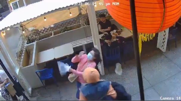 El vídeo muestra a dos hombres comiendo en una terraza de un restaurante en el barrio de Chinatown. Mientras una mujer asiática camina por la acera, un hombre con una sudadera con capucha naranja le pega un puñetazo en la cara. La cabeza de la mujer gira hacia atrás y se derrumba en el suelo. Está hospitalizada con una fuerte contusión en la cara.