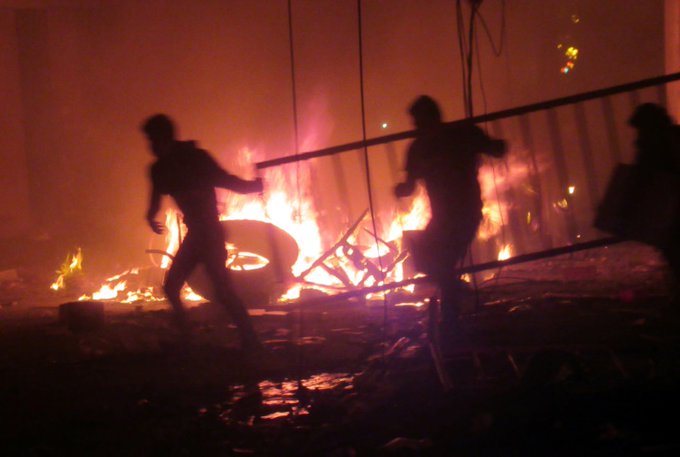 Minutos más tarde, prendieron fuego el edificio. Dos personas debieron arrojarse desde la segunda planta de la construcción para salvar sus vidas. Las llamas afectaron a casas linderas.