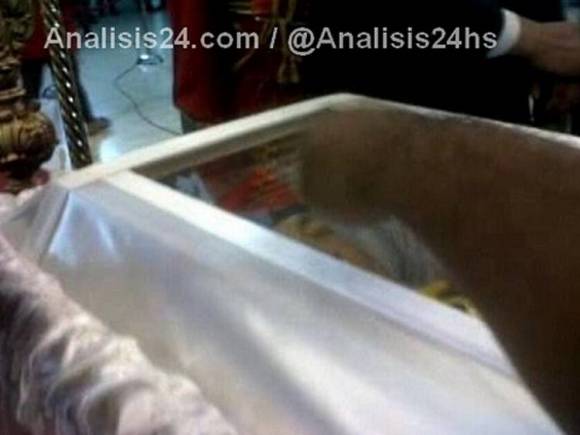 Buenos Aires, 12 de marzo.- El primero en dar a conocer una imagen del presidente Hugo Chávez en el féretro fue Univisión Noticias. El viernes pasado, el noticiero más importante de habla hispana de Estados Unidos presentó un dibujo basado en los testimonios de quienes acababan de salir de la Capilla Ardiente donde son velados los restos del mandatario hasta el viernes próximo. Pero ayer, el sitio de noticias Análisis24.com publicó una foto en la que se puede ver de costado el féretro y parte del rostro del fallecido presidente.
