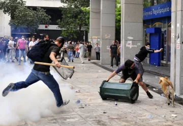 Entre los disturbios se pudo ver al Kanellos, el famoso perro callejero griego que acompaña a los manifestantes.