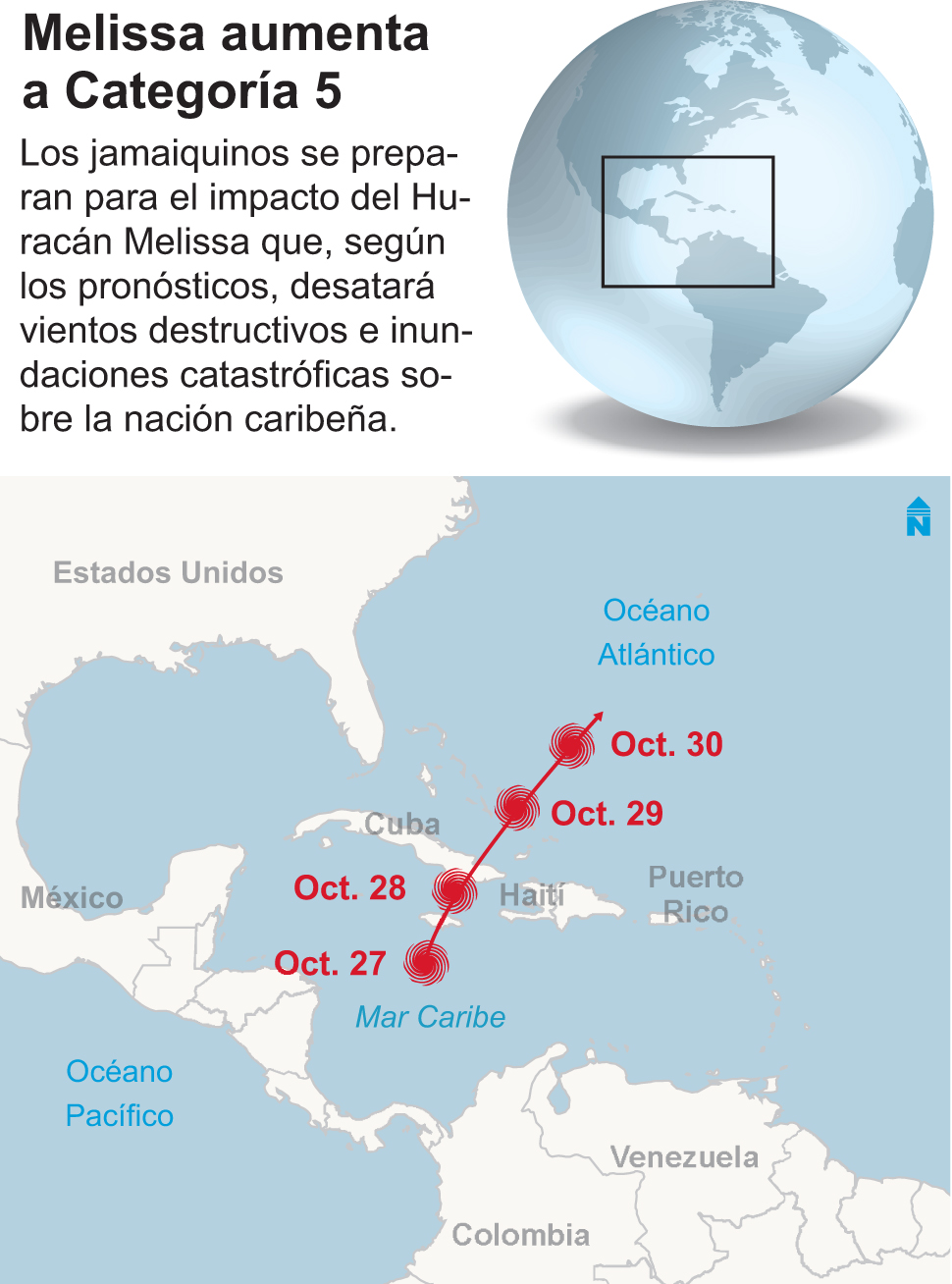 Melissa tocó tierra cerca de Nueva Esperanza, en el suroeste de la isla. A pesar de acelerar un poco su desplazamiento, la tormenta de categoría 5 sigue avanzando lentamente con vientos máximos sostenidos de 295 km/h, lo que aumentaría el riesgo de inundaciones catastróficas y condiciones peligrosas para la población.