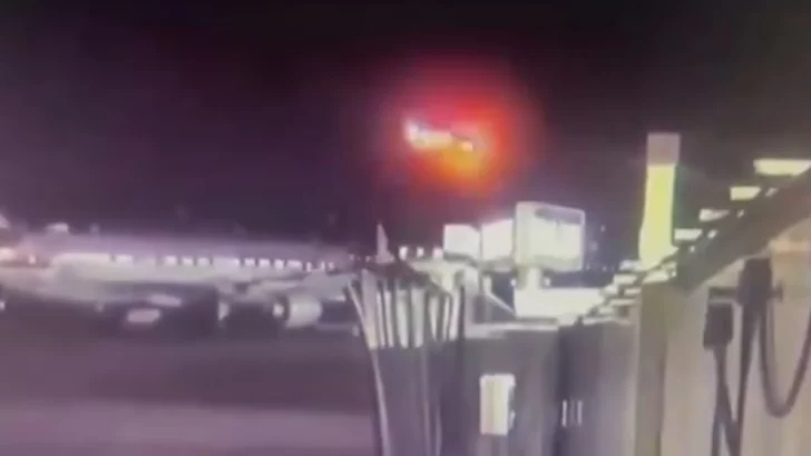 El fragmento pertenece a la grabación de una cámara de seguridad aeroportuaria, que en menos de 15 segundos captó toda la secuencia ocurrida en el cielo oscuro de la capital.