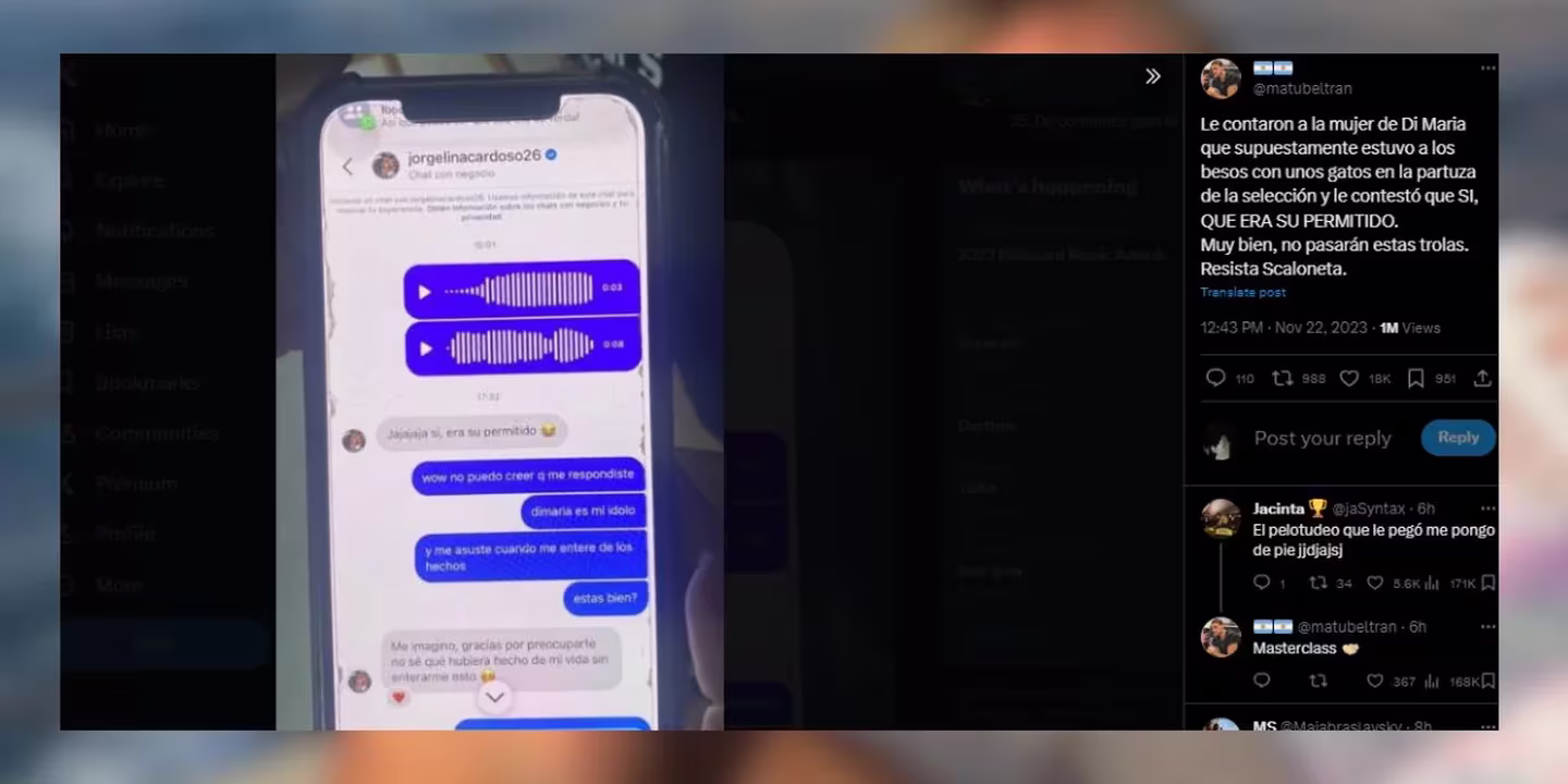 “Le contaron a la mujer de Di María que supuestamente estuvo a los besos con unos gatos en la partuza de la selección y le contestó que ‘sí, era su permitido. Muy bien, no pasarán estas. Resista la Scaloneta”, escribió una cuenta dedicada a la Selección Argentina junto a una foto del celular donde se lee que ella agrega: “No sé que hubiera hecho de mi vida sin enterarme de esto”: