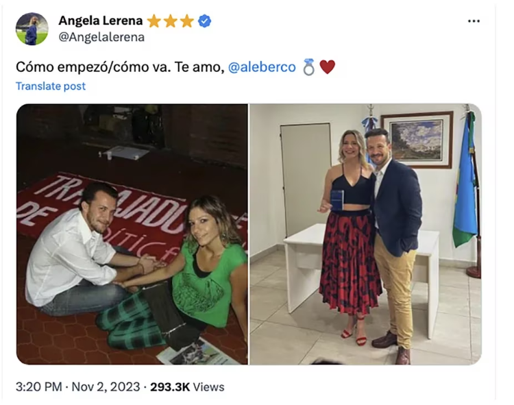 También en Twitter, Ángela subió dos imágenes comparativas y comentó: “Cómo empezó y cómo va, te amo”, le dijo ella etiquetándolo a su marido junto con una foto cuando se conocieron y otra casándose. Por su parte, él le contestó: “Qué viva el amor”, y agregó el emoji del anillo y de un corazón.