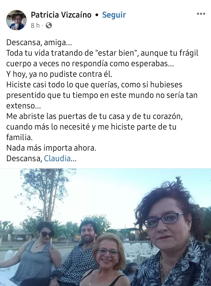 Tras haber transitado una serie de avatares con su salud -el último, una fractura de tibia y peroné que obligó un reposo del cual no salió- Claudia había sido internada el sábado pasado en el Hospital Rawson, adonde llegó consciente, con un cuadro de debilidad y deshidratación. Diagnosticada con una ‘hipercalcemia muy avanzada’ que complicó su condición general, permaneció algunos días en estado crítico y con pronóstico reservado, hasta que finalmente su agobiado cuerpo no aguantó más.
