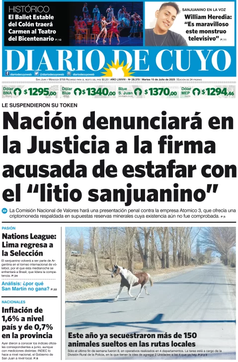 Diario de Cuyo | HOME | Noticias Tapa Edición 15 de Julio de 2025 Por Redacción Diario de Cuyo 15/07/2025 · 4:00 Escuchar la noticia Escuchar la noticia Your browser doesn’t support HTML5 audio Ver los comentarios ›