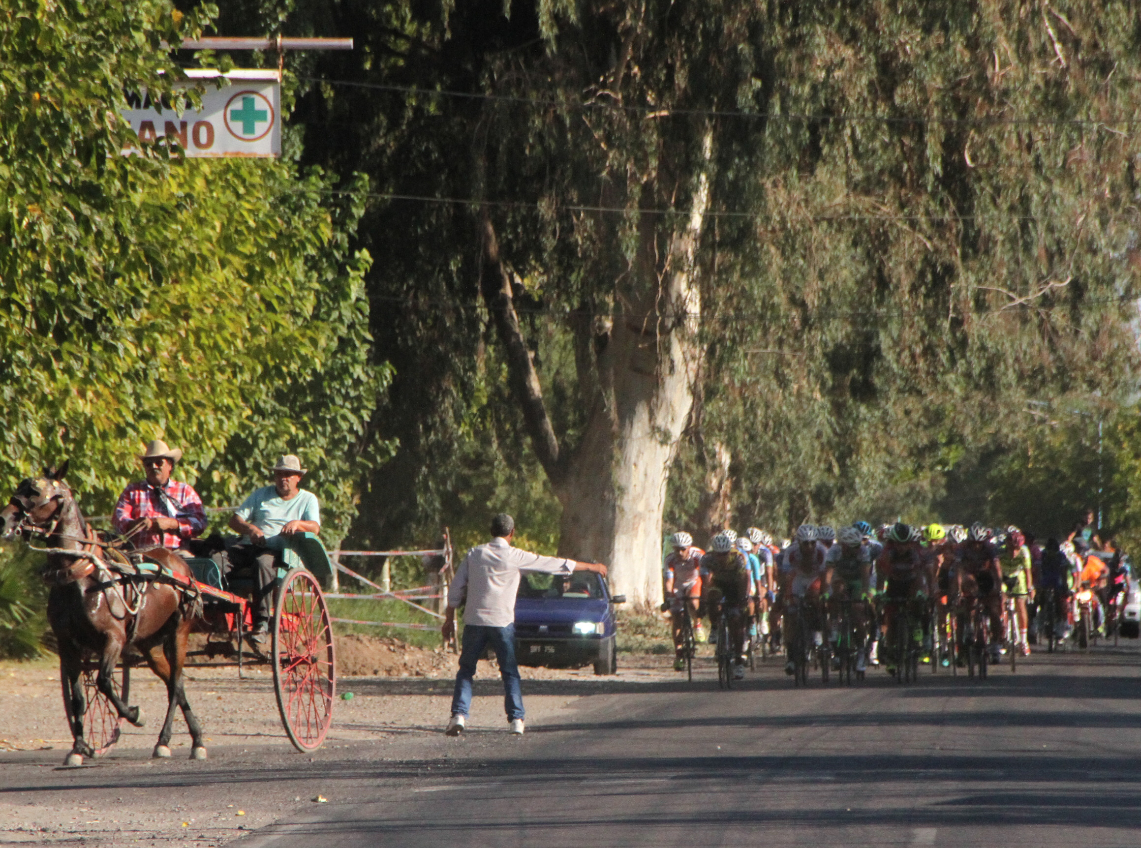 En calle Eva Perón, el pelotón transitaba rápido cuando, de la nada, apareció una carretela. Con la banquina angosta la situación se tornaba peligrosa. Pero, como en las películas, el conductor encontró una bocacalle y dobló con lo justo.