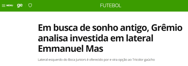 Según señaló Globoesporte, desde Gremio estarían evaluando hacer un esfuerzo económico en el actual mercado de traspasos para hacerse con los servicios del sanjuanino Emmanuel Mas.