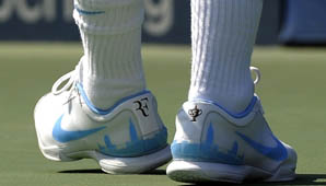 Las zapatillas de Federer tienen su logotipo, con la R y la F, y en la talonera se puede apreciar en silueta, en color celeste, la reconocible fisonomía de Manhattan. Además se puede ver un trofeo que representa la cantidad de veces que el suizo se alzó con el torneo.