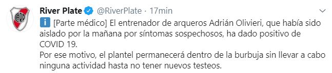 “[Parte médico] El entrenador de arqueros Adrián Olivieri, que había sido aislado por la mañana por síntomas sospechosos, ha dado positivo de COVID 19. Por ese motivo, el plantel permanecerá dentro de la burbuja sin llevar a cabo ninguna actividad hasta no tener nuevos testeos”, fue el comunicado del club de Núñez mediante Twitter.