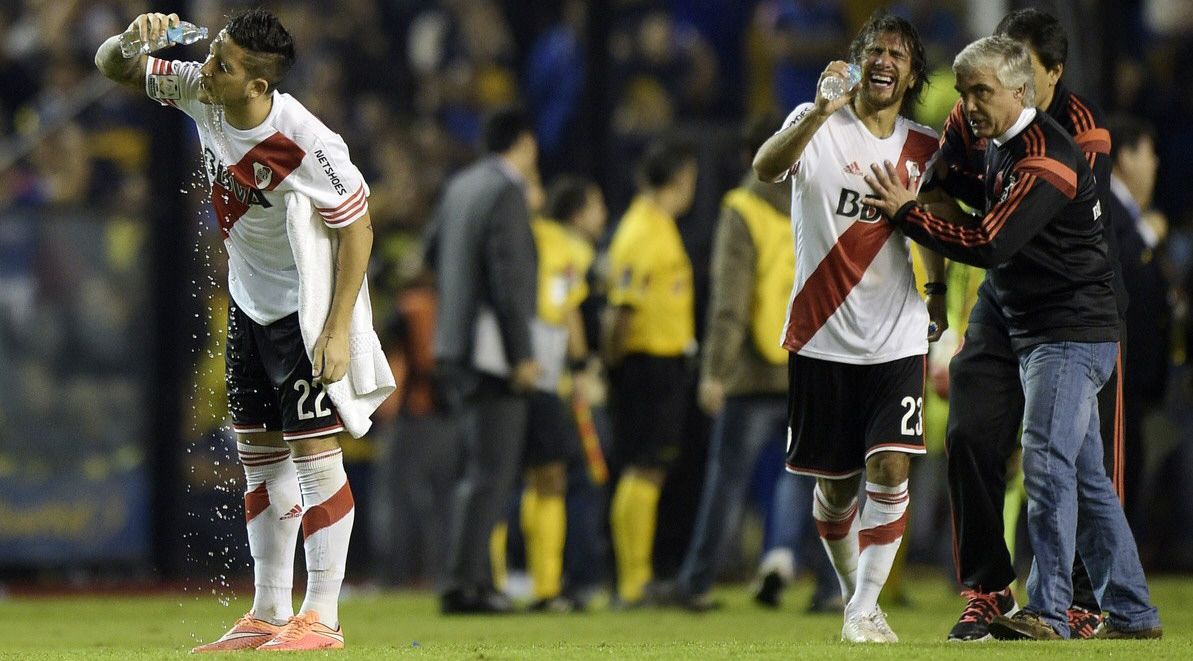 D"Onofrio ingresó al campo de juego acompañado por el dirigente Matías Patanian para sacar a sus jugadores de la cancha. Eso motivó la reacción del técnico de Boca, Rodolfo Arruabarrena, quien increpó al presidente de River, mientras el veedor de la Conmebol, el boliviano Roger Bello, intentaba comunicarse con el jefe de esa entidad, Juan Angel Napout, después procesado por el "FIFA gate".