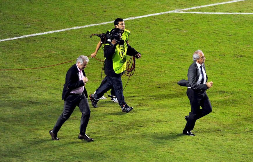 Como loco. Rodolfo D"Onofrio corre para intentar auxiliar a los jugadores. En Boca no le perdonaron esa acción.