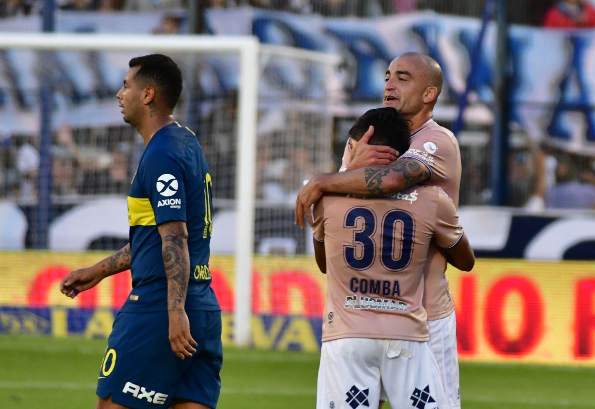 Contracara. Maximiliano Comba, autor del gol del triunfo ante Boca, es abrazado por Santiago Silva. El desconsuelo es la imagen de Edwin Cardona. En La Plata, el Xeneize continúa alejándose de la cima de la Superliga.