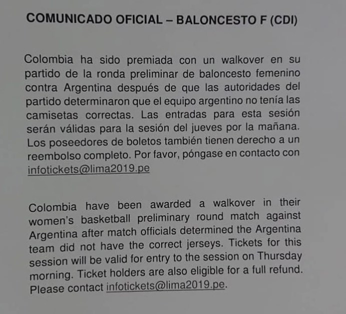 El episodio generó una demora de 15 minutos (los permitidos por Panam Sports, entidad encargada de organizar el evento). Fue un caos. La partida de dos dirigentes hacia un shopping cercano para comprar un juego de camisetas a última hora no resolvió el problema, dado que la adquisición de la indumentaria blanca no tenía los números oficiales.
