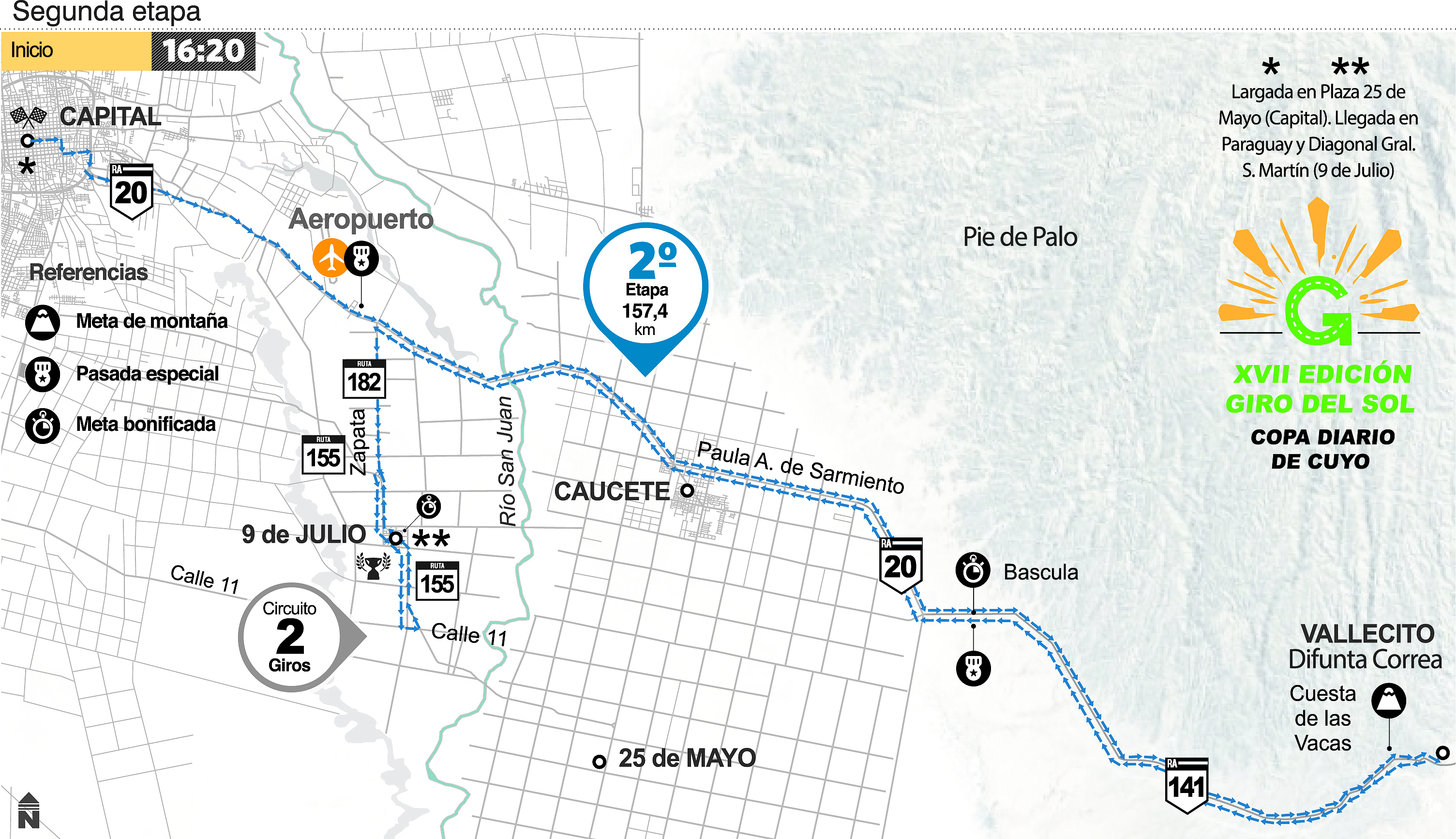 Es una de las etapas emblemáticas siempre pero hoy será especial. Por la diferencia que existe entre los primeros y los que persiguen los equipos buscarán dar el zarpazo esta tarde en 9 de Julio donde finalice el segundo parcial que previamente visitará a la Difunta Correa en Vallecito. La etapa será la más larga del Giro con 158 kilómetros -ver infografia-, partirá a las 16.20 desde la Plaza 25 de Mayo e irá hacia el paraje de la Difunta, habrán dos metas de montaña: una en Caputo y otra en lo alto de las Cuestas de las Vacas. Luego finalizarán en 9 de Julio, previo paso por el clásico circuito al que se girará dos veces.