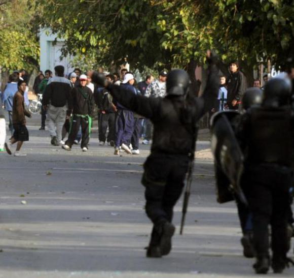 Los primeros choques entre la barra del Tomba y la Policía sanjuanina ese último sábado de abril del 2012 se produjeron al intentar desalojar la cabecera Sur del estadio y la negativa de hacerlo rápido por parte de los hinchas. Eso derivó en balas de goma de parte de los uniformados y la respuesta con piedras de los mendocinos. Sumado a que con la salida de los visitantes se dio la llegada a la intersección de calles Entre Ríos y Lautaro de hinchas de San Martín que rompieron los vidrios de uno de los dos colectivos que había traído a la delegación de Godoy Cruz.