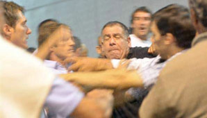 El incidente fue rápidamente interrumpido por la policía que separó a las dos partes pero no quedó ahí ya que los protagonistas todavía tenían cosas para decirse.