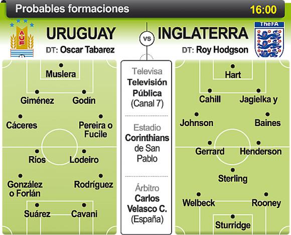 Los seleccionados de fútbol de Uruguay e Inglaterra, dos campeones mundiales que arrancaron con derrotas en Brasil 2014, chocarán hoy en un duelo clave para las aspiraciones de ambos, pues el vencedor seguirá con chances de clasificar mientras que el que pierda le dirá prácticamente adiós al certamen. El encuentro, correspondiente a la segunda fecha del Grupo D, se llevará a cabo desde las 16 en el estadio Arena Corinthians de San Pablo con el arbitraje del español Carlos Velasco Carballo.