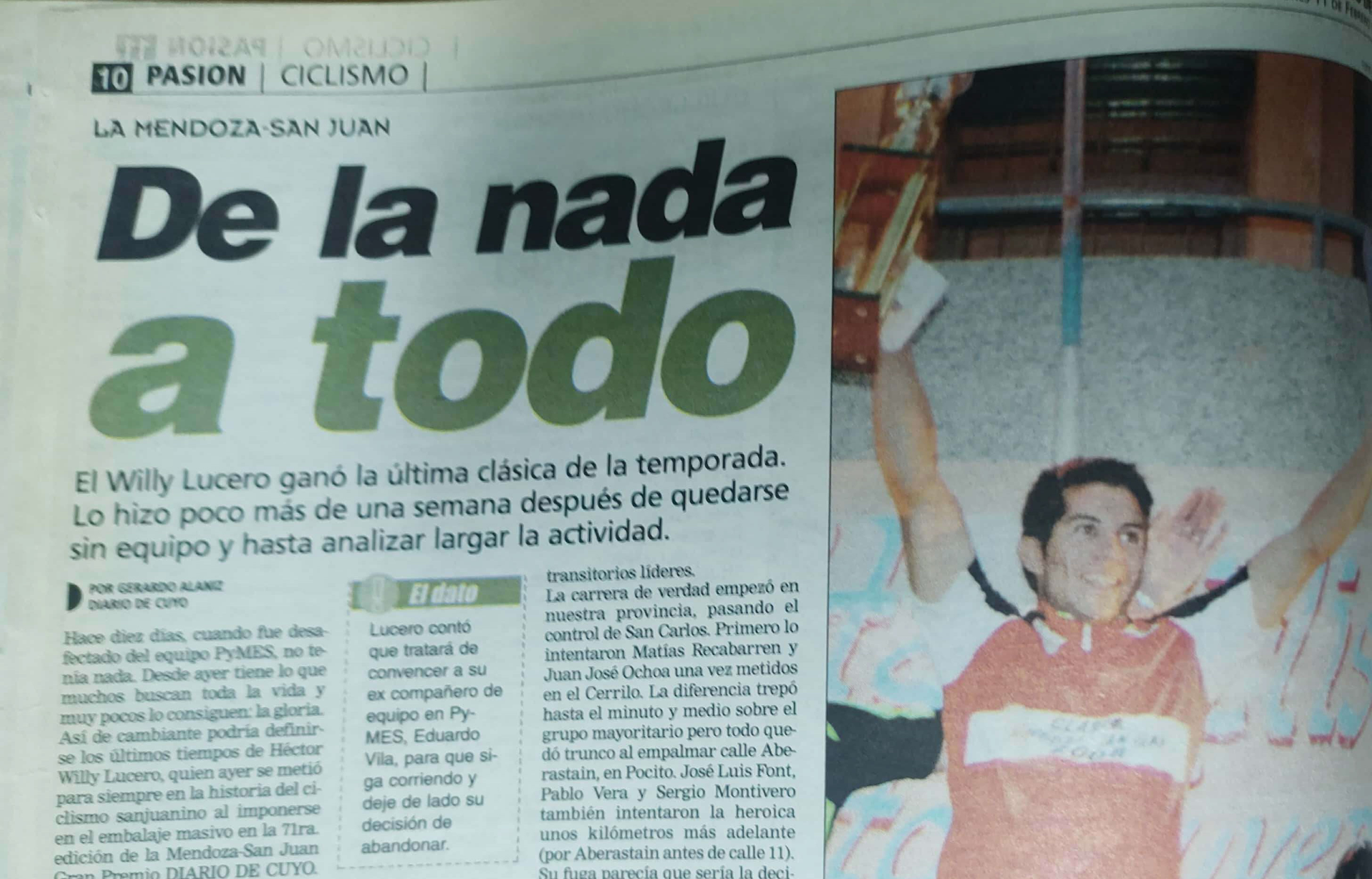 Los embalajes eran más mano a mano, más de tú a tú, y en ese mundo de ser más guapo para meter la bicicleta por una ranura, Héctor Lucero fue un especialista. Willy ganó tres clásicas, dos Mendoza-San Juan (2008 y 2014) y una Doble Media Agua (2012), pero la que recuerda con más nostalgia es la primera.