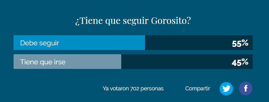 De un total de 702 lectores, el 55% opinó que debe seguir al frente del Verdinegro y el resto quiere que se vaya. Gorosito, desde que es técnico del equipo sanjuanino, pasó por ciclos muy buenos y otros regulares, pero nunca esta seguidilla que tiene en este 2018 donde no conoce la victoria.
