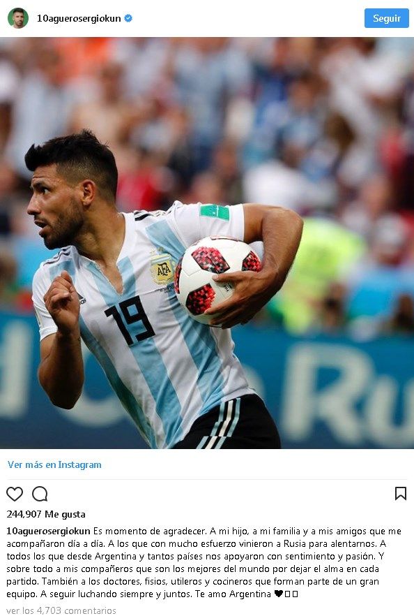 “Es momento de agradecer. A mi hijo, a mi familia y a mis amigos que me acompañaron día a día. A los que con mucho esfuerzo vinieron a Rusia para alentarnos. A todos los que desde Argentina y tantos países nos apoyaron con sentimiento y pasión. Y sobre todo a mis compañeros que son los mejores del mundo por dejar el alma en cada partido. También a los doctores, fisios, utileros y cocineros que forman parte de un gran equipo. A seguir luchando siempre y juntos. Te amo Argentina”, escribió el Kun en su cuenta oficial.