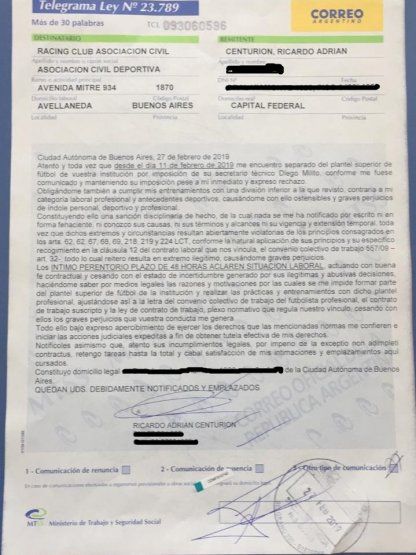 Además, en el telegrama, Centurión responsabiliza a Diego Milito, manager de la institución, de hoy estar entrenando con la Reserva de la Academia.