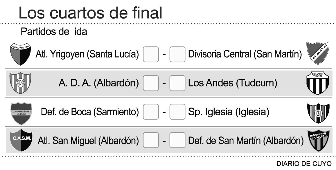 Los cuartos de final comenzarán este próximo fin de semana con el siguiente orden en los cruces: ADA-Los Andes, Defensores de Boca-Sportivo Iglesia, Yrigoyen-Divisoria Central y San Miguel-Defensores de San Martín, remarcando que esta llave entre los dos albardoneros se da por un aspecto reglamentario que indica que ante la clasificación de más de dos equipos de una misma liga, tendrán que eliminarse entre si.