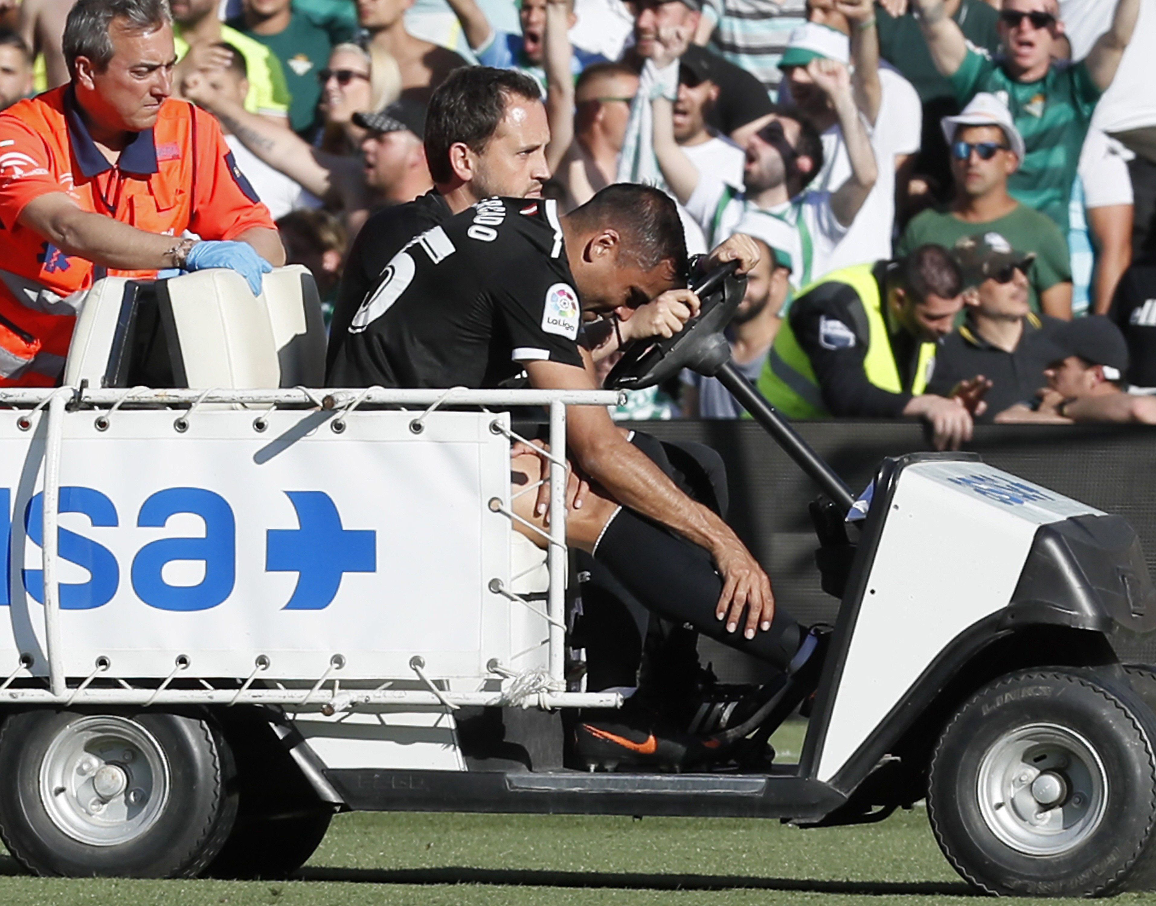 Un poco antes de que finalizara el primer tiempo del encuentro, que terminó 2-2 en el estadio Benito Villamarín, el lateral argentino intentó tirar un centro y se llevó la mano a la parte posterior de su muslo.