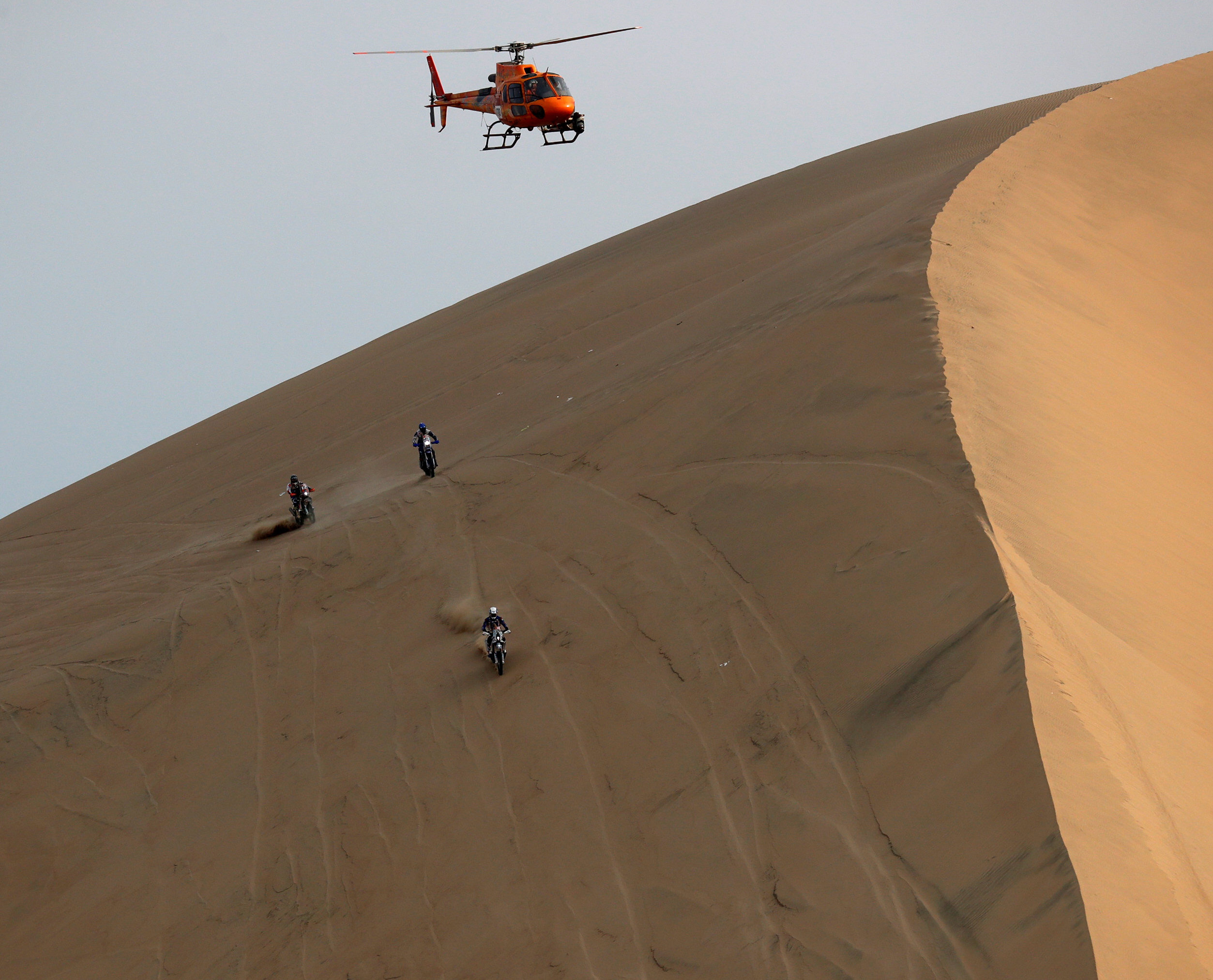 Entre dunas. Un grupo de motos avanza en lo alto de una de las dunas de la etapar de ayer.