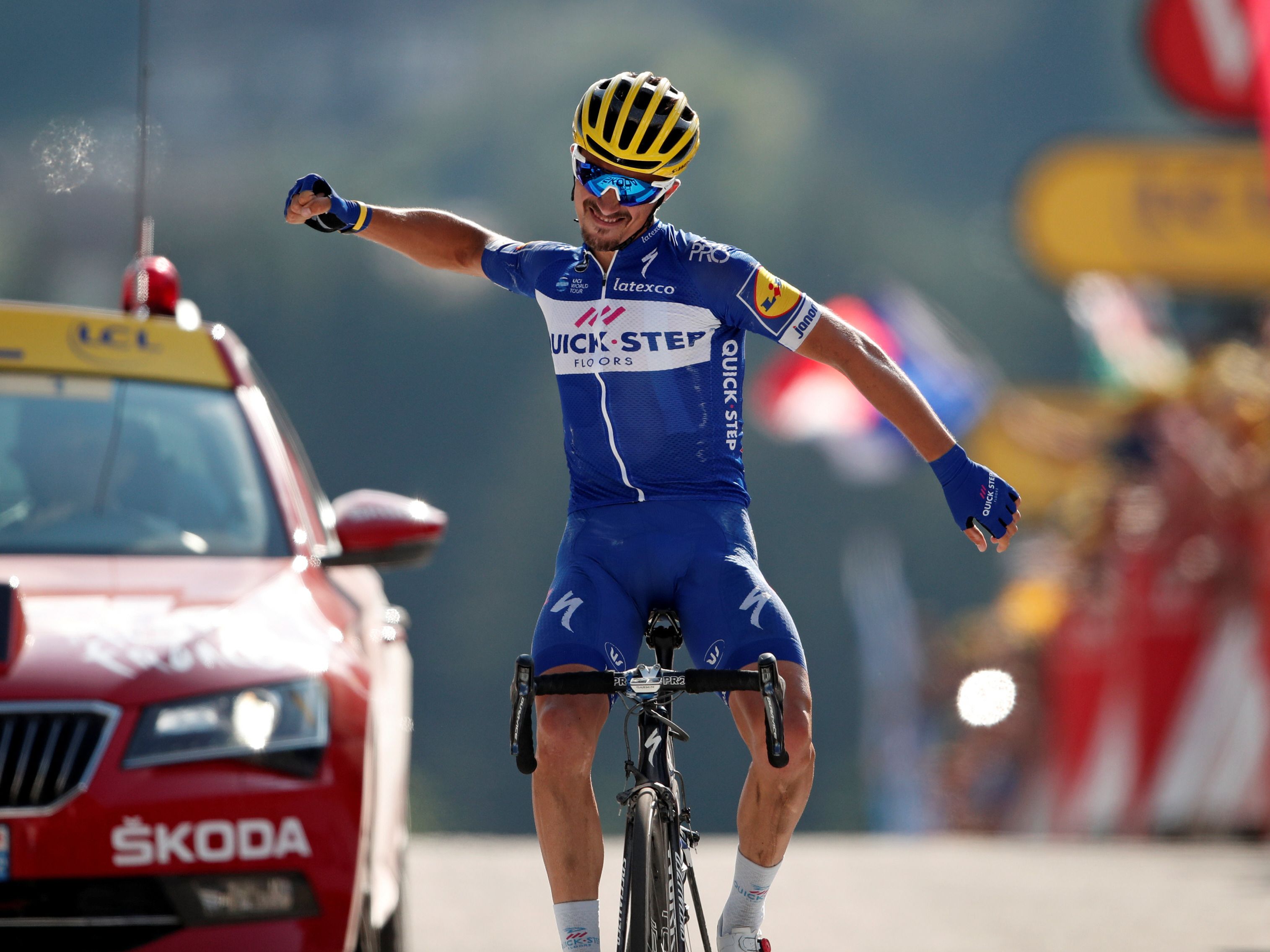 Alaphilippe, de 26 años, el corredor que batió a Valverde en la Flecha Valona, estrenó su palmarés en el Tour a lo grande: se metió en la fuga buena, atacó en el penúltimo puerto y vivió la fiesta en solitario con tiempo para la locura. Eufórico, marcó en meta un tiempo de 4h25m.27s. El ciclista de Saint Amand Montrond, nuevo líder de la montaña, firmó la victoria número 50 de la temporada con un adelanto de 1m.34s. sobre el español Jon Izagirre (Bahrain) y de 1m.40s. respecto al estonio Rein Taaramae (Direct Energie). Detrás llegaba Van Avermaet, bravo en la defensa del liderazgo de la general.
