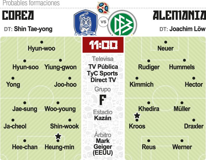 Alemania confiará en un grupo de futbolistas que no se consagraron campeones mundiales hace cuatro años para superar hoy a Corea del Sur en el cierre del Grupo F y clasificar a Octavos de final. Una sorpresiva derrota 1-0 en su primer partido ante México fue seguida por un triunfo 2-1 sobre Suecia, con jugadores como Marco Reus, Sebastian Rudy y Julian Brandt siendo vitales para el resultado. Ahora, los vigentes campeones del mundo necesitan vencer a Corea del Sur por dos goles o más para asegurar su clasificación.