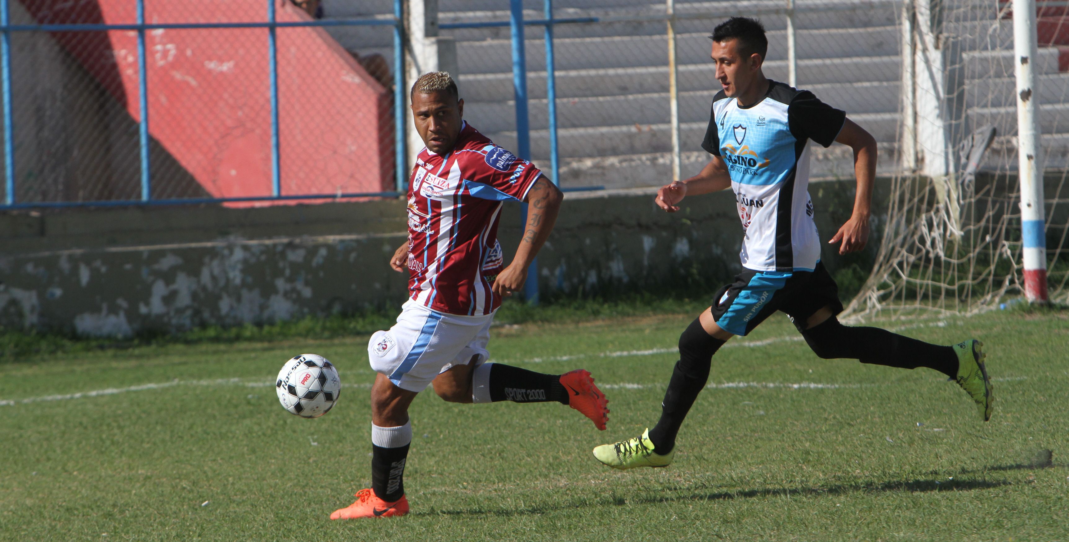 En acción. Roverbal amaga ante la marca de Alan Salinas. En Santa Lucía, Atlético de la Juventud Alianza se dio el gustito extra de dejar sin invicto a Del Bono al golearlo.