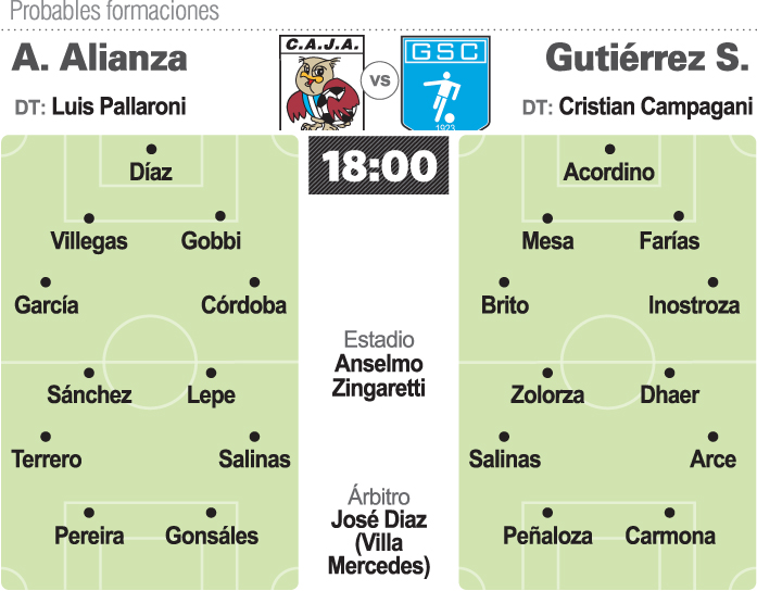 Alianza sabe que sacar un buen resultado hoy alimentará aún más la enorme ilusión que hoy tiene Santa Lucía. Con la propuesta de siempre de Luis Pallaroni, el Lechuzo irá a proponer su juego en suelo mendocino sabiendo que hasta rescatando un empate será negocio, teniendo en cuenta que la definición de la serie será en San Juan la semana próxima. Después de eliminar a EFI en San Luis, con un global 7-1, el Lechuzo se midió entre semana ante San Martín en lo que fue el único ensayo futbolístico previo al choque de hoy. Esa formación ante el Verdinegro sería la que saldría de arranque hoy, un equipo que se conoce a la perfección con la seguridad de Jairo Diaz en el arco, una defensa sólida que brinda garantías de sobra, el juego que aporta Pedro Terrero o Franco Lepe y la explosividad de Pipi Salinas, y arriba la cuota goleadora de siempre del "Morci" González y el "Gatito" Pereyra. Con eso el Lechuzo irá por todo en Mendoza.