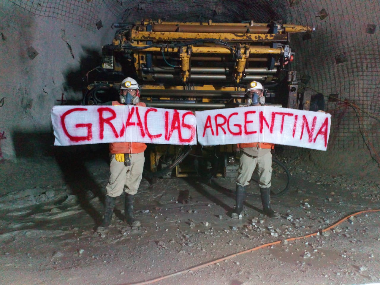 Se trata de Sebastián Fernández y Lorenzo Paéz, dos fanas de la Selección de Messi que se llevaron un trapo con la inscripción ‘Gracias Argentina’. Trabajan en el cuarto nivel de la mina, a unos 80 metros bajo tierra.