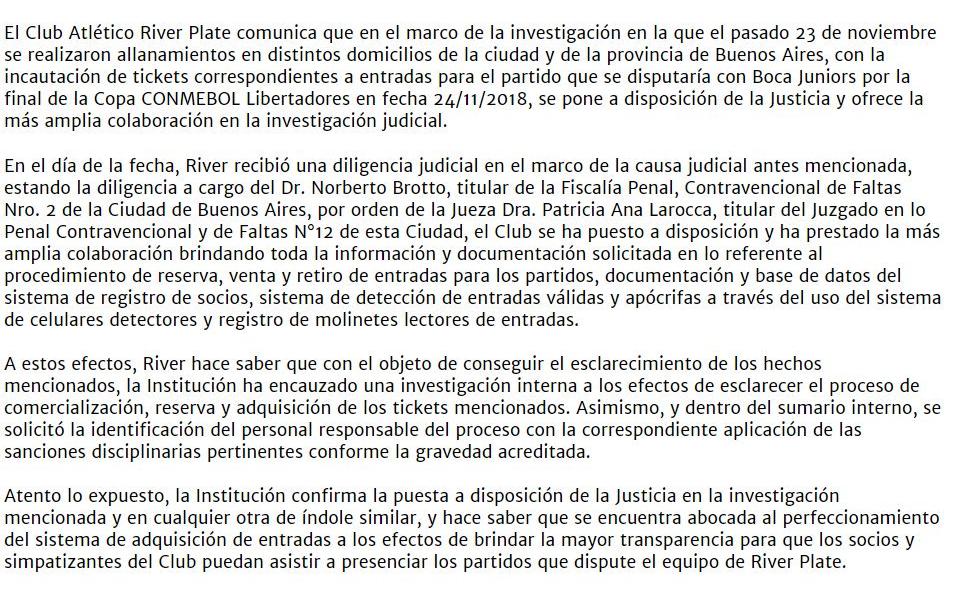 En ese sentido, el club emitió un comunicado en el que aseguró que está a disposición de la Justicia. "River recibió una diligencia judicial a cargo del Dr. Norberto Brotto, titular de la Fiscalía Penal, Contravencional de Faltas Nro. 2 de la Ciudad de Buenos Aires, por orden de la Jueza Dra. Patricia Ana Larocca, titular del Juzgado en lo Penal Contravencional y de Faltas N°12 de esta Ciudad, el Club se ha puesto a disposición y ha prestado la más amplia colaboración brindando toda la información y documentación solicitada en lo referente al procedimiento de reserva, venta y retiro de entradas para los partidos, documentación y base de datos del sistema de registro de socios, sistema de detección de entradas válidas y apócrifas a través del uso del sistema de celulares detectores y registro de molinetes lectores de entradas", consignó el parte de prensa. El club también aseguró que inició "una investigación interna".